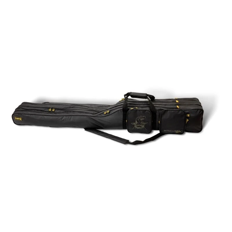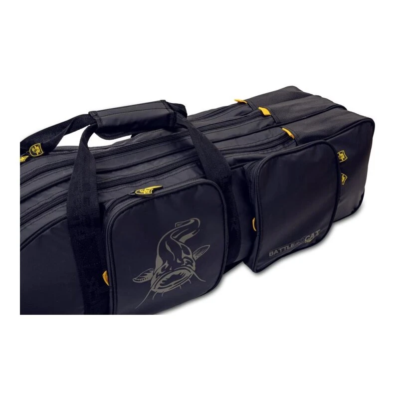 Robuste Ruten-Transporttasche für bis zu drei montierte Welsruten mit großer Rollenausbuchtung. In den kleinen aufgesetzten Seitentaschen finden Handschuhe und diverse Kleinteile wie Vorfachschnur und Haken Platz. In der großen Seitentasche können Banksticks mit Umlenkern sicher