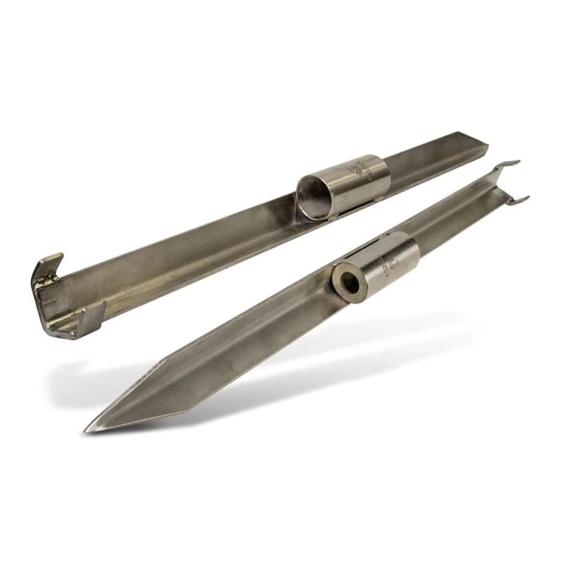 Der Rutenhalter fürs Leben – Stefan Seuß‘ Spezial Welsrutenhalter, der in den spanischen Felsen, am sandigen Po-Ufer oder der Steinpackung des heimischen Rhein zuverlässig einsetzbar ist. Dieses Rutenhalter-Modell kann alles und verträgt Hammerschläge, wo andere Rutenhalter in sich zusammenbrechen. Kein Rutenhalter-Typ hat mehr 100-Kilo-Wallern standgehalten als dieses Modell. – V2A 4mm- 48er Rundrohrbuchse mit Wasserauslass und einer Höhe von 10cm, passend für alle Ruten-Endkappen und sicherer Halt der Rute bei Fehlbiss-Rückschlag- Gesamtlänge 85cm: Ermöglicht perfekten Halt in Sand, Lehm, Erde und Kiesböden
