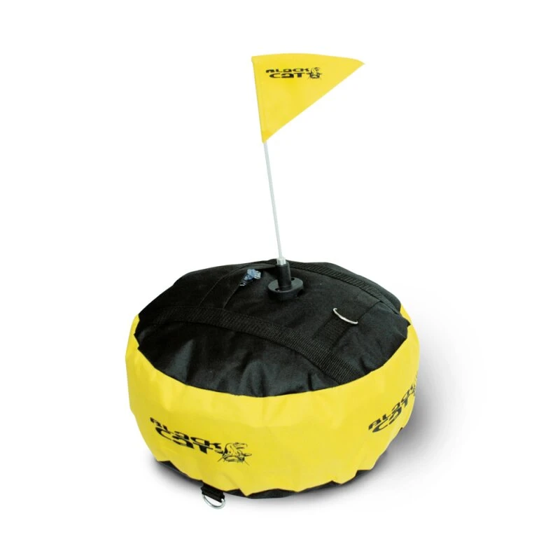 Die Boje ist mit den beliebten Black Cat Farben versehen und verfügt über einen halter für Ihr Knicklicht, eine Halteöse zum Verankern und einen Reißleinenhalter, der so hoch angebracht ist, dass eventuelles Treibgut einfach unter der Reißleine hindurchschwimmen kann.