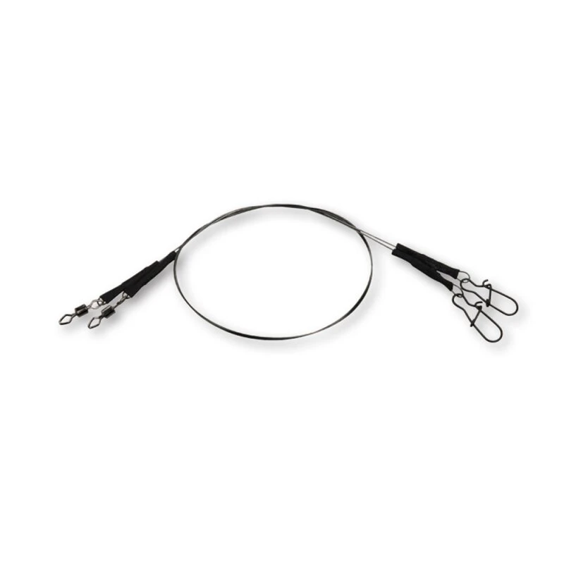 Hochwertiger, knickfreier Single Strand Titanium Leader, doppelt gecrimpt für Stärke und Sicherheit, ausgestattet mit einem hochwertigen EFFZETT Diamond Rolling Wirbel in der richtigen Größe und einem EFFZETT® D-Lock Snap. Die Quetschhülsen sind mit schwarzen Schrumpfschlauch abgedeckt.