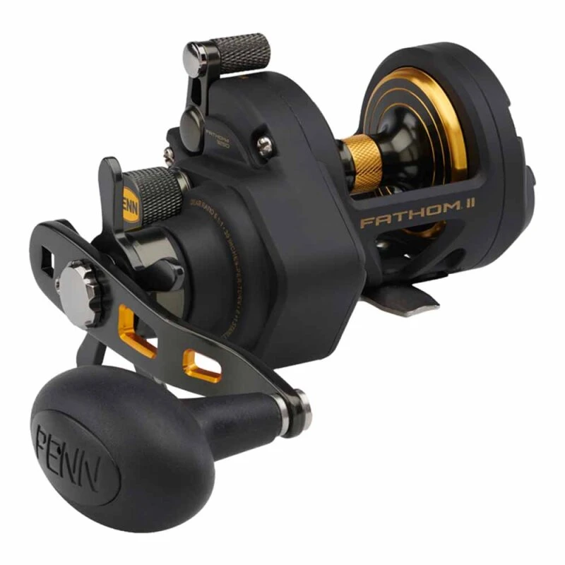 Die zweite Generation PENN® Fathom® II Star Drag Reel kommt mit starrem Metallrahmen und Seitenplatten, jetzt mit neuen Eigenschaften um sie noch anglerfreundlicher zu machen. Über die abnehmbare Seitenplatte kann man schnell und effektiv auf das Getriebe und das HT-100™ Bremssystem zugreifen und damit arbeiten. Das PENN live Spindle Design bietet weite, mühelose Würfe, während die Gebtriebeübersetzung (nur bei ausgewählten Modellen)