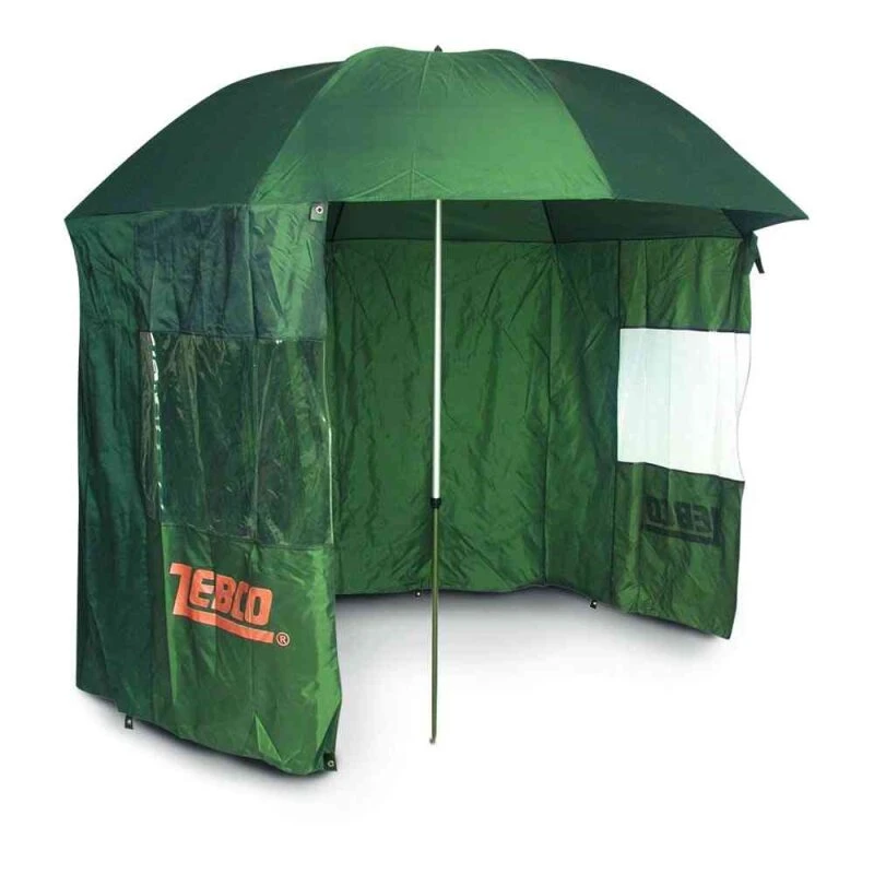 Standard-Schirm mit angesetztem, abnehmbarem Windschutz und Fenstern auf beiden Seiten. Stablänge einstellbar. Heringe und Befestigungsleinen im Beutel im Lieferumfang.